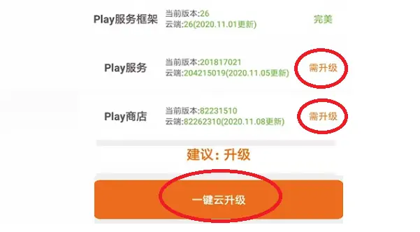 打开之后系统会自动检测您安卓手机的谷歌服务框架环境,在以下检测到的界面中点击需升级,如果手机中有谷歌服务部分框架套件,那么会自动显示完美,只要显示需升级就直接在下图中点击升级即可,直到三个套件变成完美,您的谷歌服务框架就可以正常使用了!