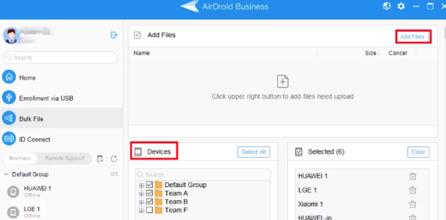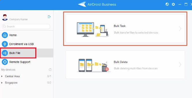 - 现在,使用 AirDroid Business 的批量传输功能在多台设备上部署 OBB 文件。从客户端选择“批量文件”选项,然后选择“批量任务”,这样您就可以将文件发送到批量设备。